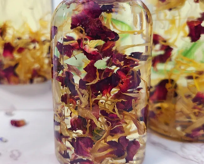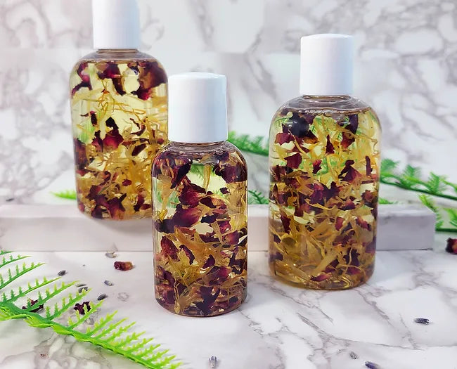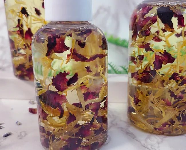 This body oil is infused with rose petals and calendula petals that have amazing benefits for the skin.