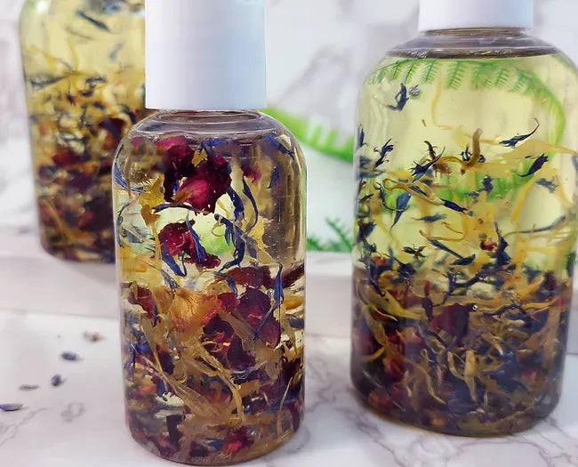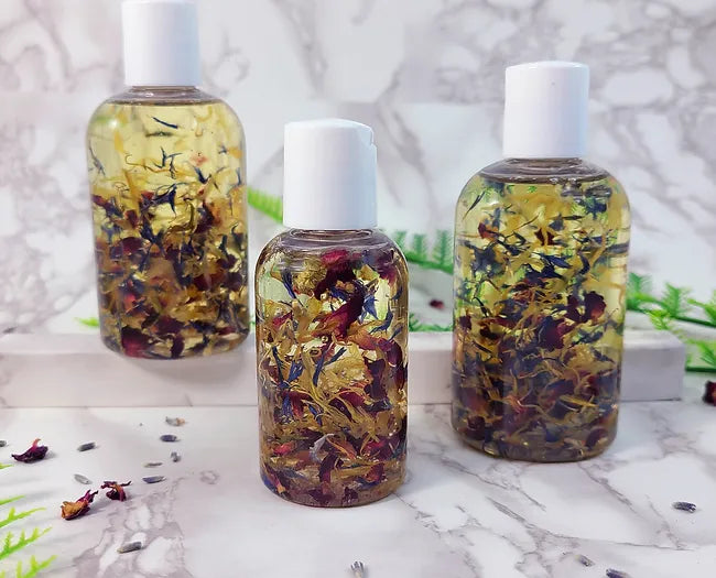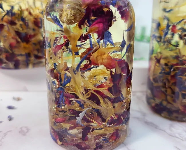 This body oil is infused with calendula flowers, blue cornflower petals, and rose petals that have amazing benefits for the skin.