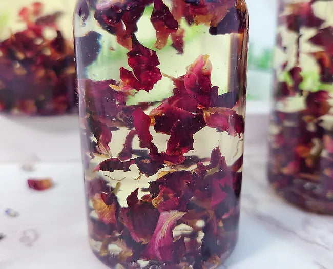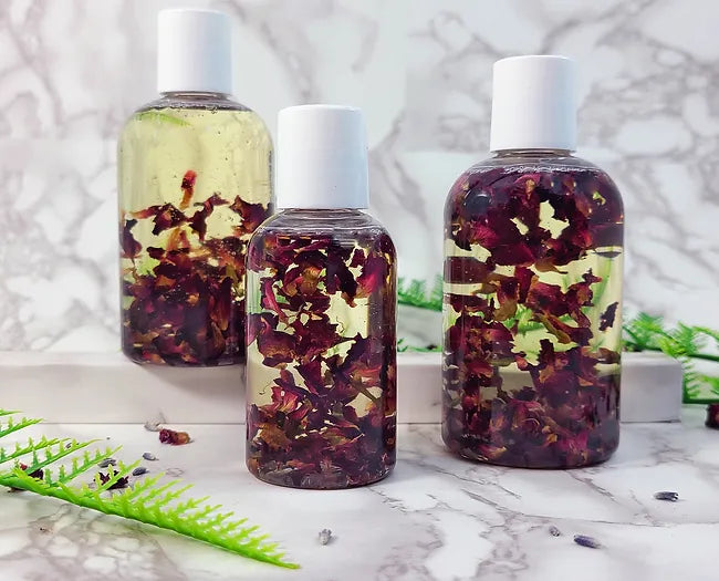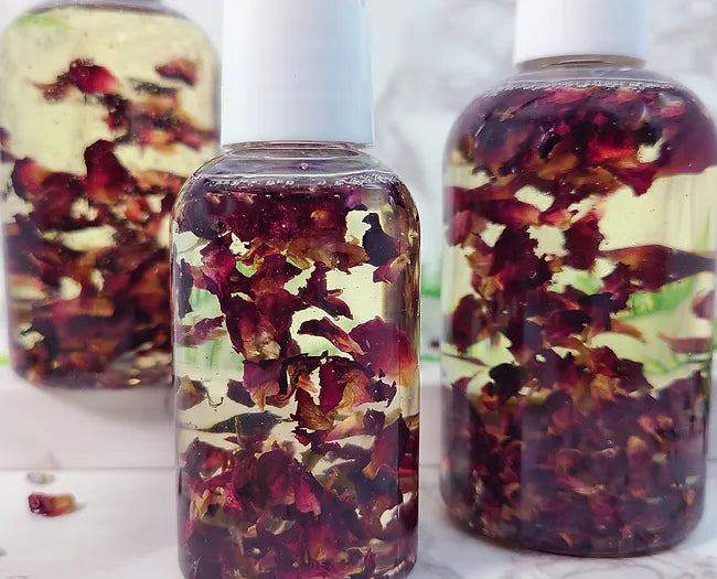 The rose body oil is infused with rose petals that have amazing benefits for the skin.